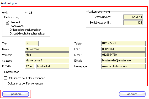 • Anschließend befinden Sie sich im Fenster "Arzt anlegen".