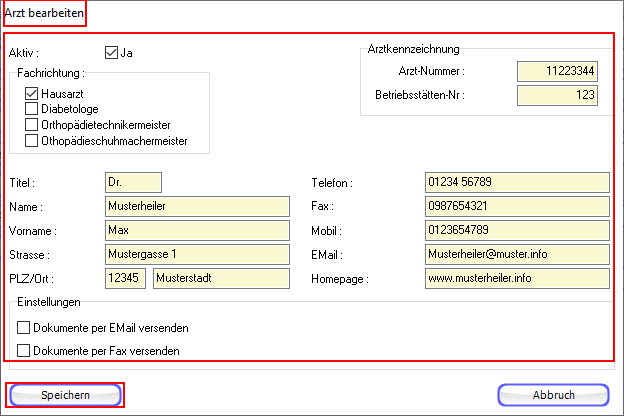 • Im Anschluss daran befinden Sie sich im Fenster "Arzt bearbeiten".