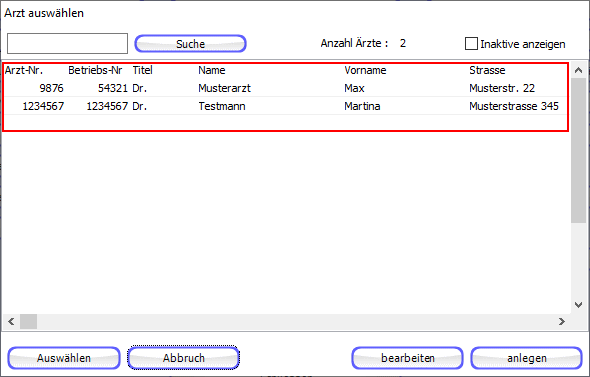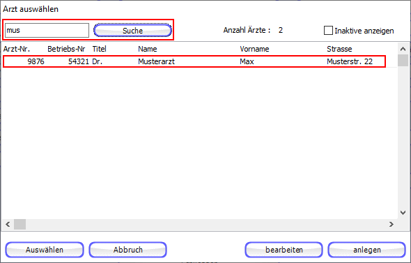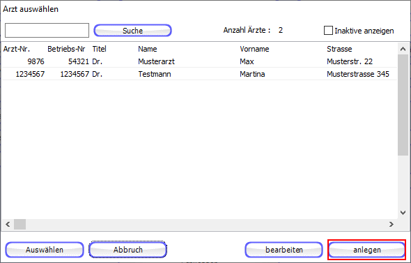 • Zum Anlegen eines neuen Arztes klicken Sie auf die Schaltfläche "anlegen".