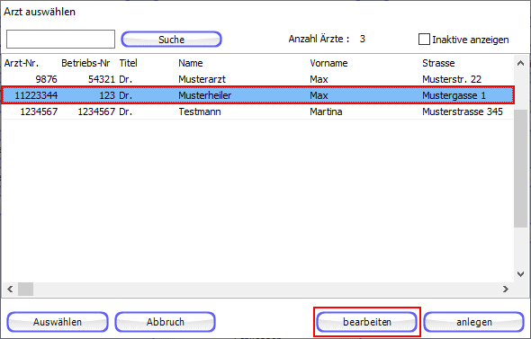 • Zum Bearbeiten eines bereits angelegten Arztes klicken Sie einmal mit der linken Maustaste auf den gewünschten Eintrag bis dieser blau hinterlegt ist.