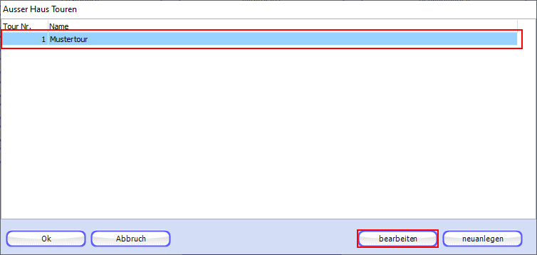 Zum Bearbeiten einer vorhandenen Tour klicken Sie mit der linken Maustaste auf den gewünschten Eintrag, so dass dieser blau hinterlegt ist.
