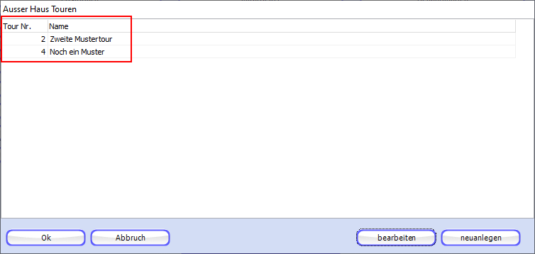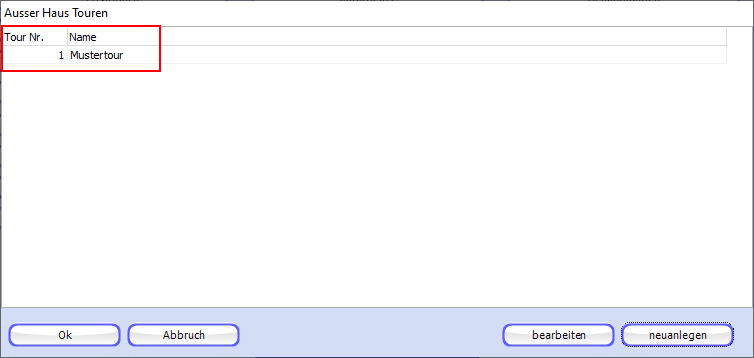 Im Fenster "Ausser Haus Touren" sehen Sie eine Übersicht ihrer aktuell angelegten Touren.