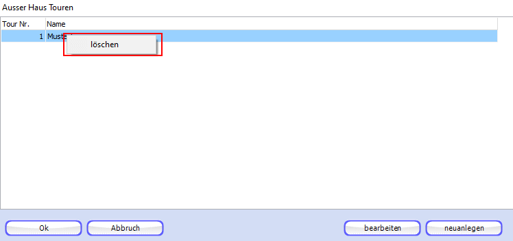 Zum Löschen einer Tour klicken Sie mit der rechten Maustaste auf den Eintrag der gelöscht werden soll.