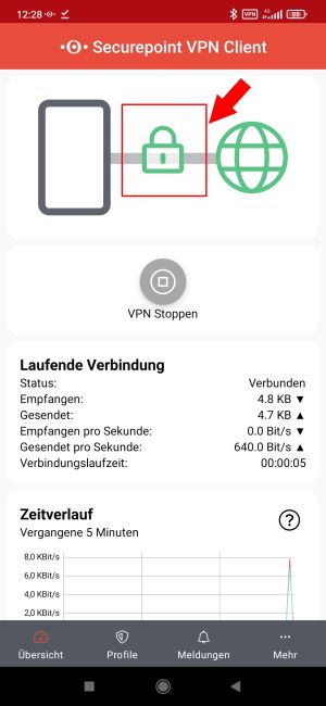 Wurde die VPN Verbindung erfolgreich hergestellt, so sehen sie auf dem Startbildschirm nun, wie in der Markierung zu erkennen, ein grünes Schloss.
