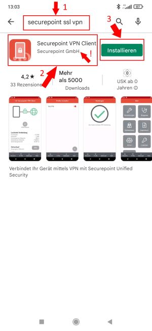 Öffnen Sie den Google Play Store und geben Sie in das Suchfeld (1) "securepoint ssl vpn" ein.