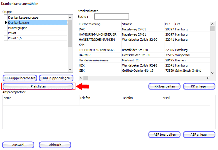 Im Anschluss daran öffnet sich das Fenster "Krankenkassenpreislisten".