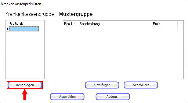 In diesem Beispiel wird eine neu erstellte Krankenkassen-Gruppe genutzt, in welcher noch keine Preislisten vorhanden sind.