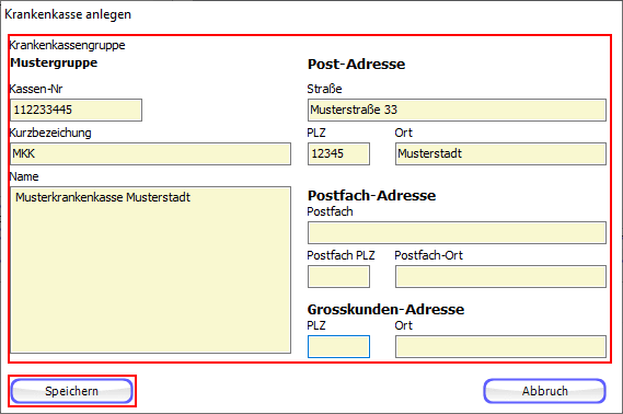 In diesem Beispiel wird in der Krankenkassen-Gruppe "Mustergruppe" eine neue Krankenkasse angelegt.