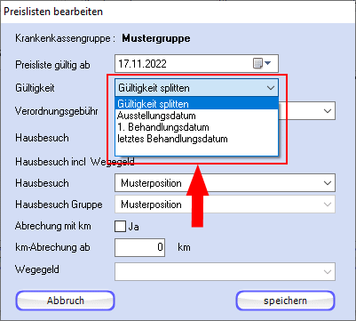In der Zeile "Gültigkeit" haben Sie die Möglichkeit zu definieren ab wann die neue Preisliste - mit Bezug zur Verordnung - gelten soll.