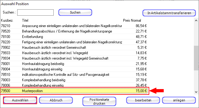 Klicken Sie zur Auswahl der gewünschten Position mit der linken Maustaste auf die Position bis diese markiert ist. Anschließend klicken Sie auf die Schaltfläche "Auswählen".
