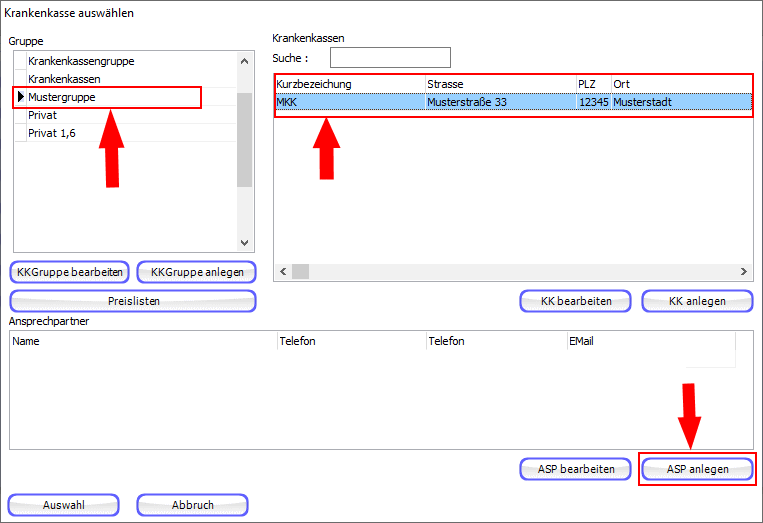 Zum Anlegen eines Ansprechpartners markieren Sie zunächst die Krankenkasse für welche Sie den Eintrag vornehmen möchten und klicken Sie auf die Schaltfläche "ASP anlegen".