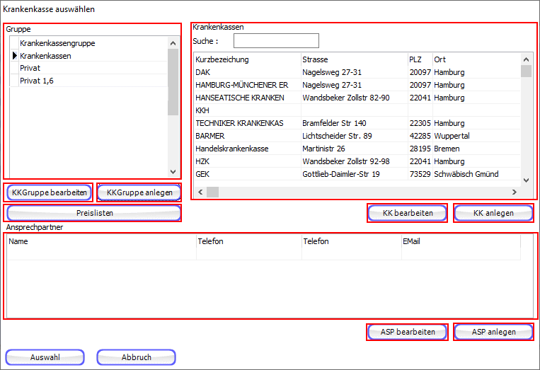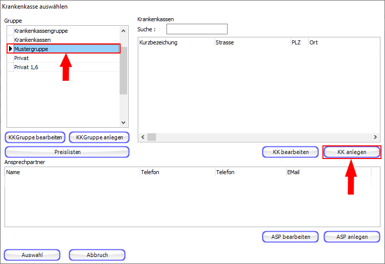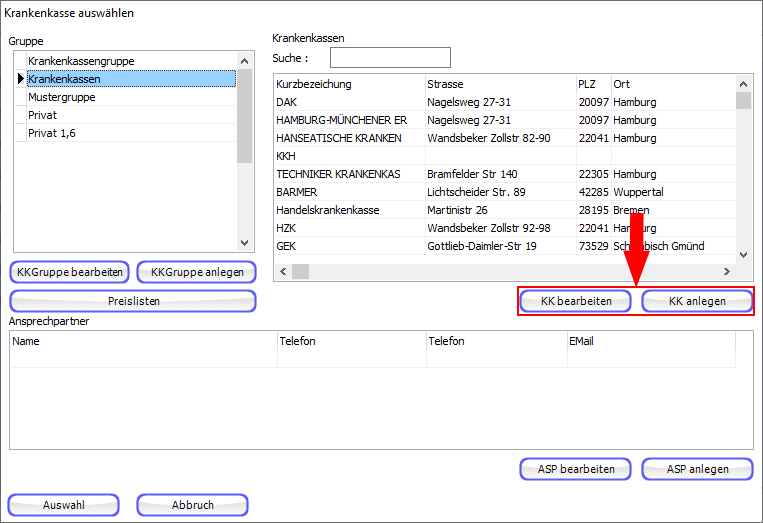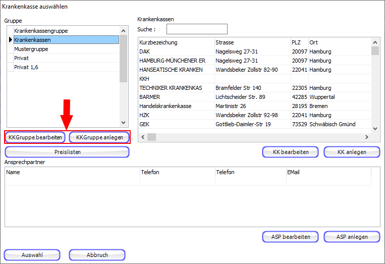 Hinweis: Im Gegensatz zu den Krankenkassen-Gruppen und den Krankenkassen können Sie Ansprechpartner für alle Krankenkassen anlegen!