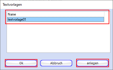 Anschließend wählen Sie aus dem Fenster "Textvorlagen" die gewünschte Textvorlage und bestätigen ihre Auswahl mit einem Klick auf die Schaltfläche "Ok".