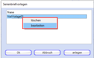 Zum Bearbeiten und/oder Löschen Ihrer Vorlagen, klicken Sie mit der rechten Maustaste auf die gewünschte Vorlage.