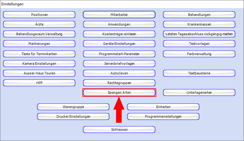 Im Fenster "Einstellungen" gelangen Sie über einen Klick auf die Schaltfläche "Spangen-Arten" zur Übersicht der Spangen.