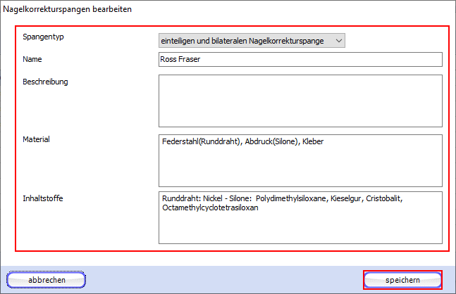 Nach einem Klick auf die Schaltfläche "bearbeiten" gelangen Sie auf das Fenster "Nagelkorrekturspange bearbeiten".