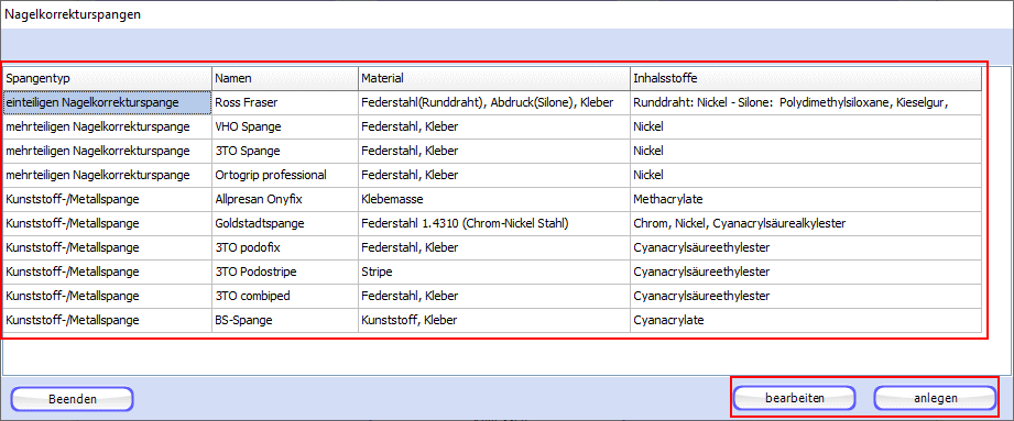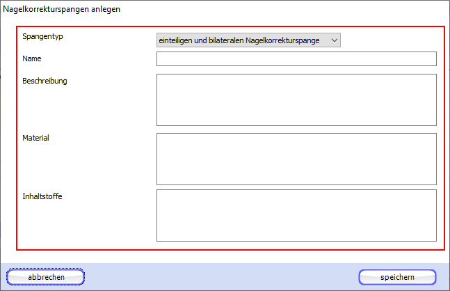 Über einen Klick auf die Schaltflächen "bearbeiten" und "anlegen" gelangen Sie jeweils in das Fenster zum Bearbeiten respektive Anlegen einer Nagelkorrekturspangen.
