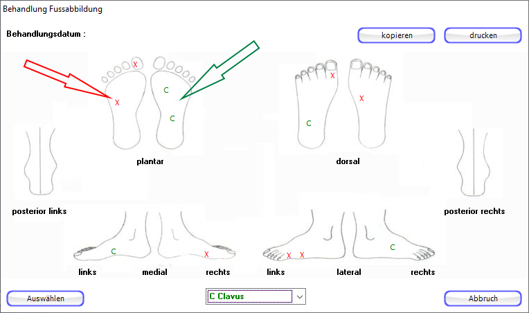 Mit einem Klick auf die zu behandelnde Stelle des Fußes, können Sie exakt die betroffene Stelle markieren.