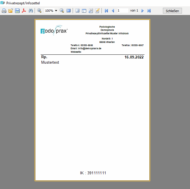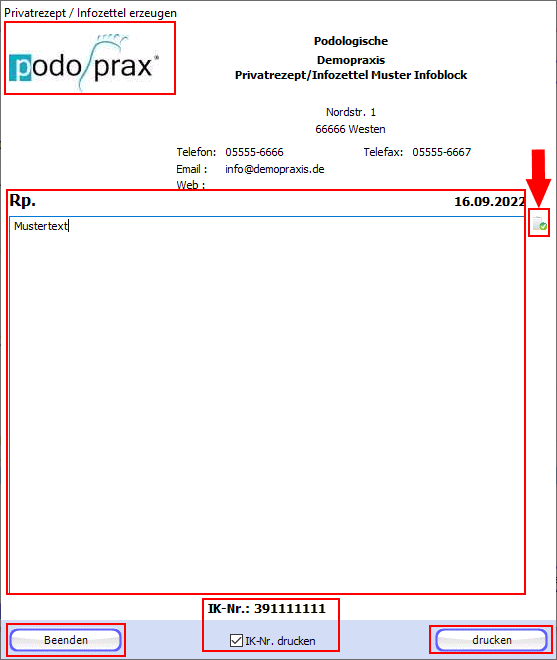 Indem Sie einen Haken bei IK-Nr. drucken setzen wird die IK-Nr. entsprechend angezeigt.